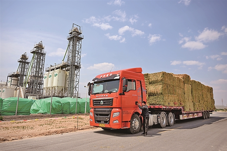 在内蒙古赤峰市阿鲁科尔沁旗,满载牧草的货车准备启程。新华社发