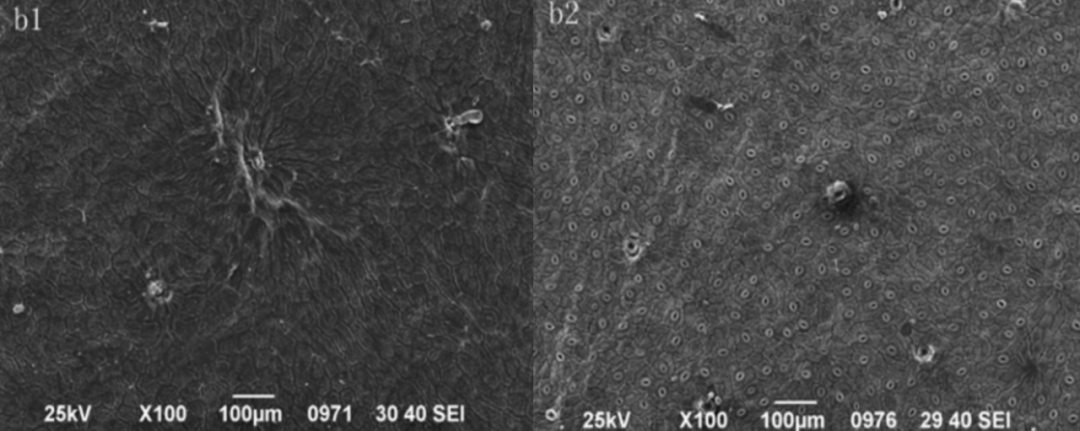 女贞叶片扫描电镜图片 上表皮(左) 下表皮(右)来源:参考文献3